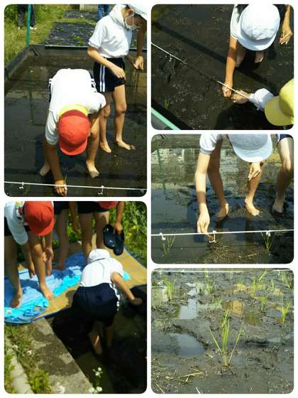 稲の植え付け加減が難しかったようで、愛育会の方に「もっと根元をもって、深く(植える)。」と教えていただきました。