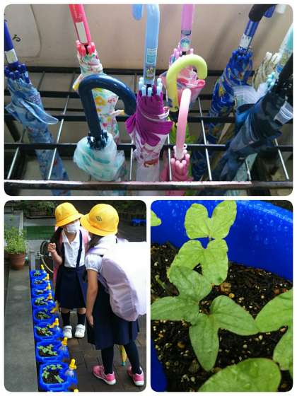 どの子もクルクルきれいにたたんで傘立てに入れています。