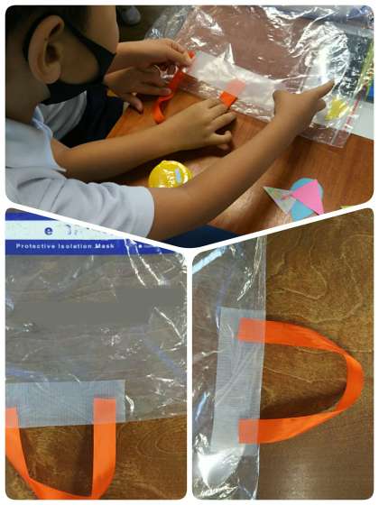 あるクラスでは、配付されたときの袋に取っ手をつけて、机の荷物掛けにかけられるよう工夫していました。
