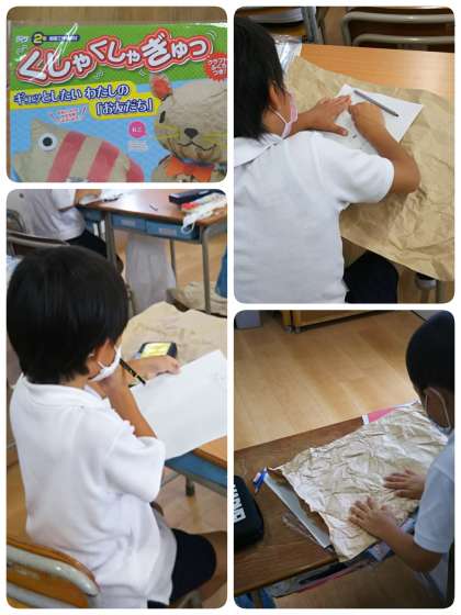 2年生の工作です。大きめの紙袋をくしゃくしゃにして、マスコットを作ります。