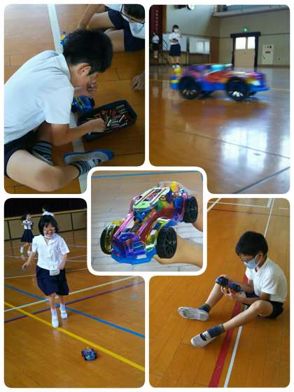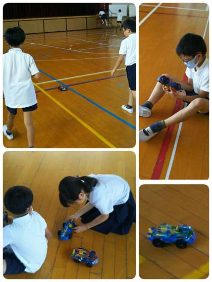 4年生が、前の時間に作成したモーターカーを講堂で走らせます。