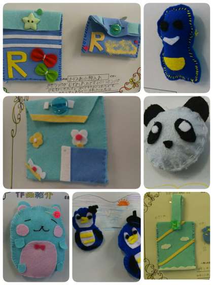 ペンケース・マスコット・ティッシュカバーなど、かわいい作品が教室の掲示板をにぎやかにします。