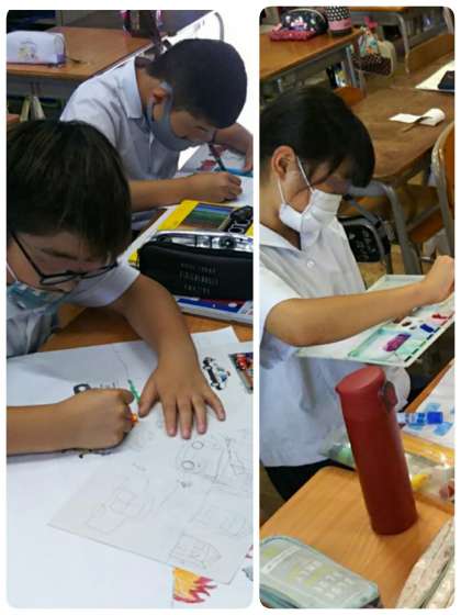 使う画材は自由です。水彩絵の具・色鉛筆・・・様々なものを使って一生懸命描きました。