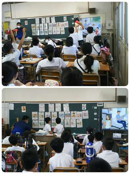 写真はキーワードゲームで、先生が言った生活用語(例:Take a bath お風呂に入る)のイラストを探して、ピコピコハンマーで先に差し示した方が勝ちです。