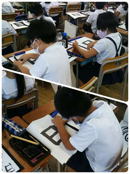 3年生が「折れ」に気を付けて「日」の字を書きます。