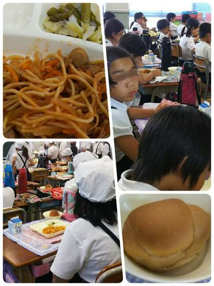 学習でがんばった疲れを給食で癒します。スパゲッティは、にんじん・ピーマン・ウインナーなど,たくさんの具が入っていて、いろんな味の調和が楽しめます。