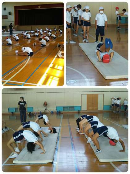 準備運動で筋肉をほぐし、今日は前転・後転・ブリッジに挑戦です。