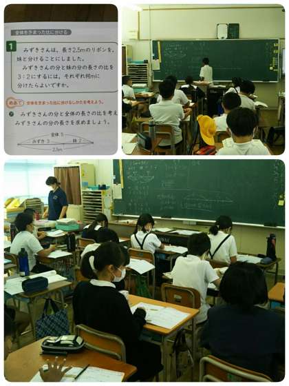 決まった長さのリボンを、ある割合(の長さ)で2人で分けます。