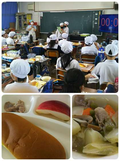 【パン・牛乳・鶏肉のガーリック焼き・豚肉と野菜のスープ煮・りんご】