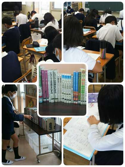 教室前に、図書館から借りた平和学習に関する図書を置いています。