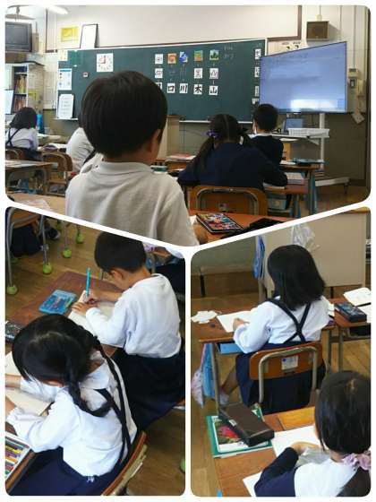 先生が黒板に描いた絵を子どもたちも描き写して、視覚的に覚えます。