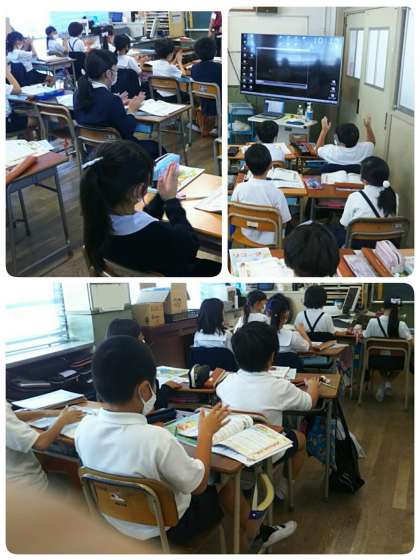 大型テレビから流れる演奏に合わせて、みんなで机をたたいてリズムをとります。