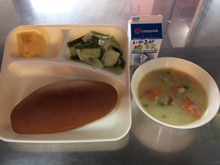 10月28日 給食 公開日 2020/10/28 更新日 2020/10/28 お知らせ 米粉を使ったコーンクリームシチューにはジャガイモがたっぷり入っていました。ほんのり甘みがあって美味しかったです。今年初めて柿(平種無し柿)がでました。皮をむいて提供しています。1/4個ずつです。 【コーンクリームシチュー・キャベツとサンドマメのサラダ・柿・黒糖パン・牛乳】