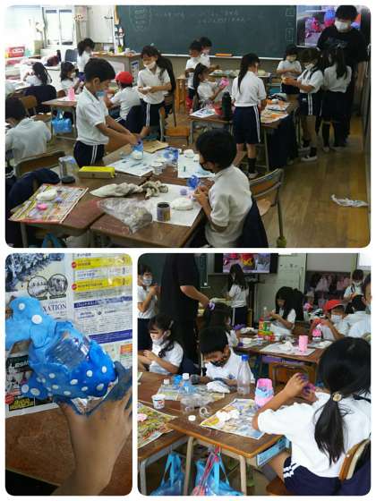 前回のクラスと同じく、色を付けた粘土をあき容器にペタペタと飾り付けていきます。