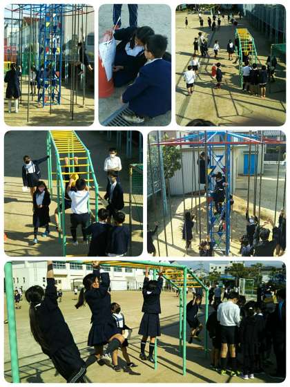 のぼり棒は、1本の棒に抱き着くようにしたり、2本の棒にぶら下がるようにしたりして、エッサエッサとのぼります。