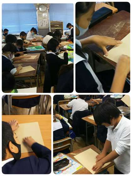 着色の際、絵の具が塗りやすいよう、紙やすりで表面を軽く削ります。