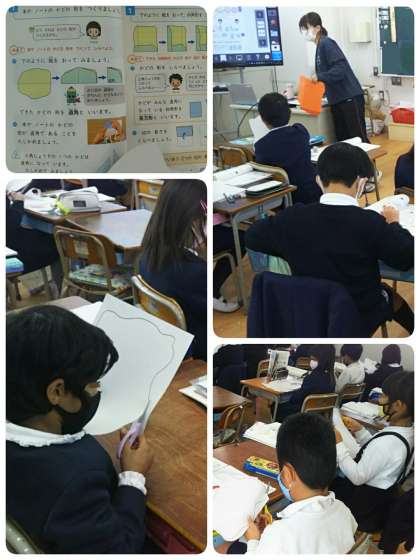 適当な形の図形の紙を折ってかどの形を調べたり、四角形を作ったりします。