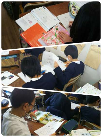 おすすめの本を紹介するカードを作ったり(国語)、社会や理科の復習プリントをしたりしています。