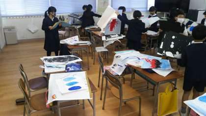 2年生です。このおよそ1年間に描きためた作品を整理し、作品袋に入れています。