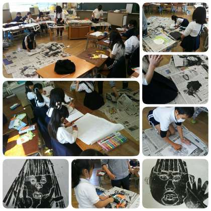 次は床に広げた新聞紙に移動して、紙にインクを写し取っていきます。