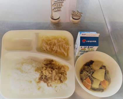 5月はタケノコのおいしい季節です。今日は、かつお節とゴマをあわせて炒めたメニューです。かつお節は、必須アミノ酸を豊富に含んでおり、発酵食品でもあります。タケノコの食物繊維とともに整腸作用が期待されるおいしい献立です。