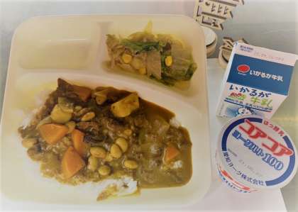 今日のカレーライスには、大豆が入っています。大豆は、肉や魚に負けないほどたんぱく質を多く含んでおり、体をつくる栄養源です。ジャガイモやニンジン、玉ねぎも入って具だくさんのルーでしたが、多くの子どもたちが笑顔でモリモリ食べていました。