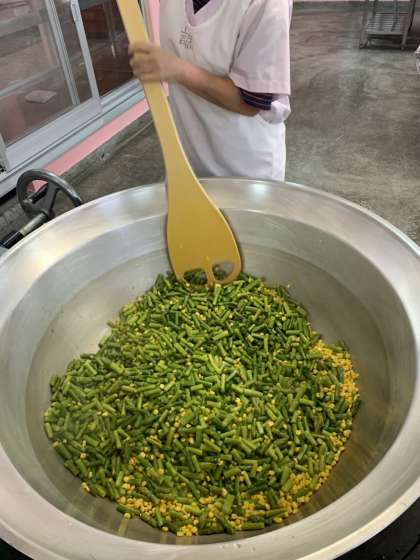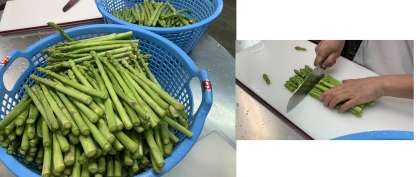 今日は、給食調理の工程を少しご紹介します。たくさんのアスパラガスを洗ったあと、手で大きさをそろえて切ります。そのあと、大きな釜でほかの具材や調味料を合わせて、大きなしゃもじで混ぜ合わせて作ります。なかなかの労作業です。