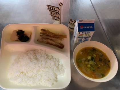 子どもたちは、歯ごたえのある天ぷらをしっかりと噛んで食べていました。豚汁やわかたけには、風味もよくご飯が進んでいる子が多かったです。