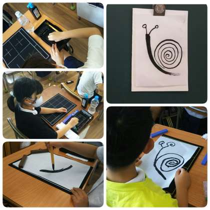黒い「すずり」に無色透明な水を差すと、すずりの色が透けて見えるため、それだけで黒い液体ができたように錯覚してしまいます。しばらくの間墨をすって、習字用紙に線をかきます。すった後の液体が思っていたほどの濃さになっておらず、「うわ、薄い。」と、驚きの声を上げる児童もいました。
