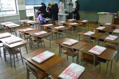 明日行われる入学式の準備に新6年生がお手伝いに登校してくれました。準備は、整いました。良い入学式が迎えられそうです。また、新2年生は、明日、入学式で披露する歓迎の演技の練習を行いました。新入生のみなさん!明日は元気に入学式にきてくださいね。在校生のお兄さんお姉さん、教職員一同、皆さんが入学してくれることを楽しみに待っています。