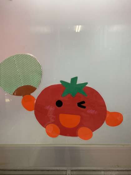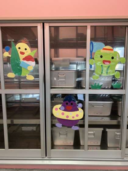 給食室では、夏休み中に手作りした楽しい壁面掲示で、給食調理員の皆さんが歓待していました。