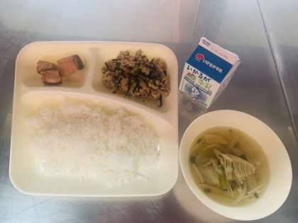 高野豆腐の炒り煮は、ヒジキやグリンピースも入っていて、おいしく甘辛い味付けでした。とても、ごはんの進むメニューでした。