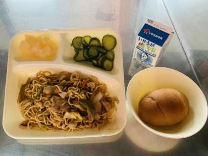 学校給食の焼きそばには、たくさんの具材が入っています。いか、豚肉、キャベツ、玉ねぎ、にんじんが入っていて、野菜が苦手な子も面と一緒に食べやすくなっています。