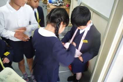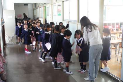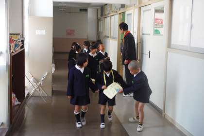 2年生の子どもたちが、1年生の子どもたちを連れて、学校内を案内して回りました。2年生の子どもたちは、優しく丁寧に説明をしてくれていました。