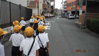 校区めぐり(1年生) 公開日 2021/10/06 更新日 2021/10/06 学習のようす 今日(10月6日)は、1年生が校区めぐりをして、地域の公園や住宅のようすを見たり、道路の安全な歩き方などについて体験的に学習しました。 学校を出て左へまわり、中島東公園まで歩いて、公園で少し遊びました。そのあと、五社神社の前を通って学校の北側の道路を通って帰りました。 「こっちのほうに来たことなかった。お店があるんだね!」「この公園で遊ぶのはじめて!」と楽しく活動できました。