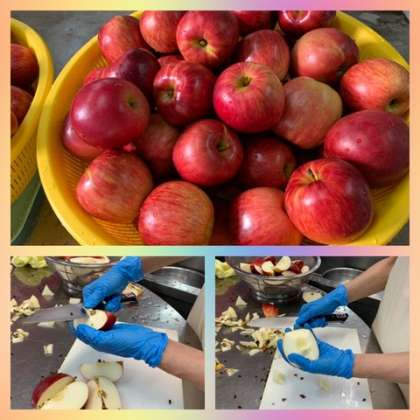 リンゴのおいしい季節になりました。真っ赤なリンゴを、給食調理員の皆さんがていねいに食べやすい大きさに切っています。