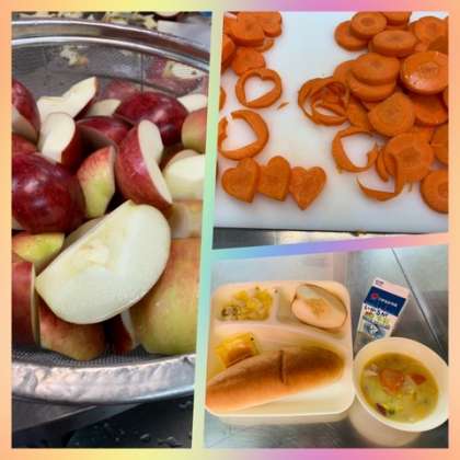 クリームシチューには、幸せのニンジン(ハート形に切ったもの)を入れてくれています。子どもたちは、「シチューの中に入っているかな?楽しみ!」と喜んで食べていました。