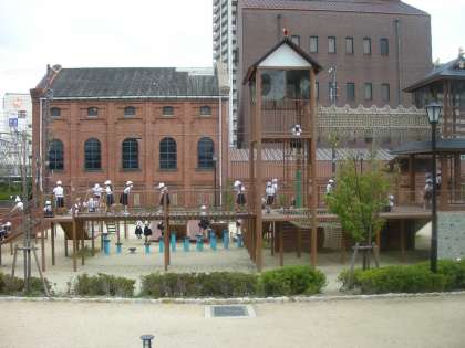 尼崎城址公園では、アスレチック型の遊具で遊んだり、芝生広場でみんなで「だるまさんがころんだ」をしたり、仲よく楽しむことができました。