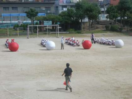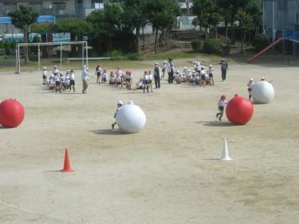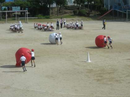 さわやかな秋晴れの中、11月6日(土)の「川北運動フェスティバル」に向けて、「大玉ころがし」(団体競技)の練習をしていました。