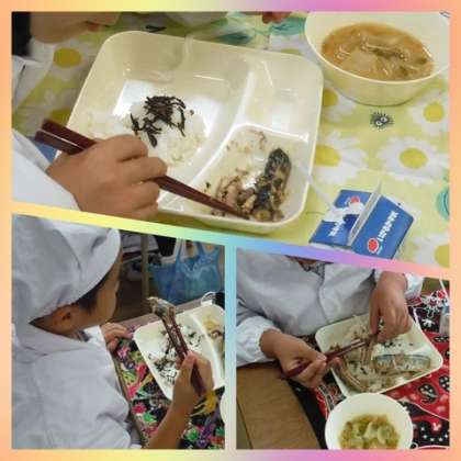 1年生は、はじめて給食にさんまが出たのですが、はしや指をつかって、小骨をとったり身を取り分けたりして、上手に食べていました。