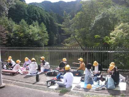 昼食(お弁当)の時間です。自然の中で、みんなで食べる食事は、「最高の気分」です。
