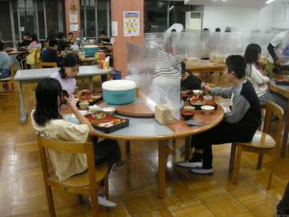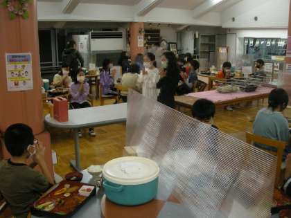 食事係が、ビニール手袋を着用し、すべての児童分を配膳しました。一人一人が、手洗い、アルコール消毒をしっかり行い、「いただきます。」の合図で、「黙食」しました。