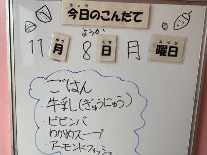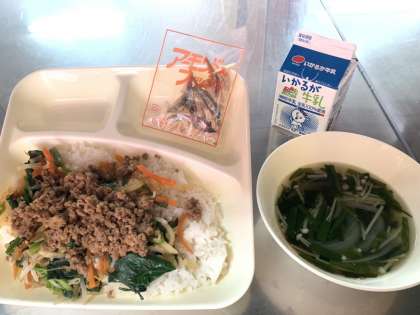 今日の給食<11月8日(月)> 公開日 2021/11/08 更新日 2021/11/08 給食 11月8日(月)の給食の献立は、以下のとおりでした。 〇本日のメニュー ・ビビンパ ・わかめスープ ・アーモンドフィッシュ ・牛乳 今日は、韓国・朝鮮の料理です。 韓国・朝鮮のお祝い料理の定番が、わかめスープです。誕生日や出産のお祝いでわかめスープを出す習慣があります。これを飲むことには、親に感謝の気持ちを持つ意味もあるとのことです。