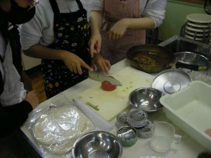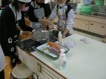 6年生は、グループごとにメニューを考え、調理実習を行いました。日頃のお手伝いができている児童は、食器、食材の洗浄、調理等を手際よくすすめていました。