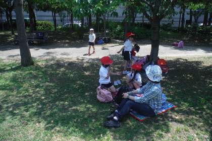 5月13日(水)1年生は「元浜緑地公園」に遠足に行きました。子どもたちは、元気いっぱいに公園を走り回ったり、大きな滑り台を滑ったりして、楽しい時間を過ごしました。行き帰りの交通安全のため、校区を出る所で愛育会の方が見守りをしていただきました。ありがとうございました。