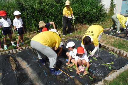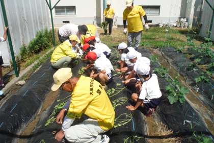 1年生と2年生が、愛育会のご協力のもと、芋の苗を植えました。子どもたちは、植えながら「早くお芋にならないかな!」と期待を込めながら、作業をしていました。愛育会の皆様には、畑の草抜きや土への肥料入れや成長するまで及びお芋掘りまでの期間の手入れ等、たいへんお世話になることに感謝申しあげます。どうぞ、よろしくお願いします。