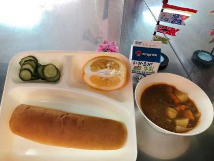 今日は、洋風メニューが並びました。甘夏かんは、香りがよく気持ちも穏やかにしてくれるフルーツです。分厚い皮をむくのがむずかしい子もいましたが、がんばってむいて食べていました。