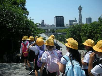 みんなで仲良くのんびりと、「昼食タイム」を過ごした後、天王寺公園、新世界(通天閣)を通り、JR新今宮駅まで歩きました。歩行中や電車内での態度もすばらしく、成長した姿を見せてくれました。よくがんばりました。