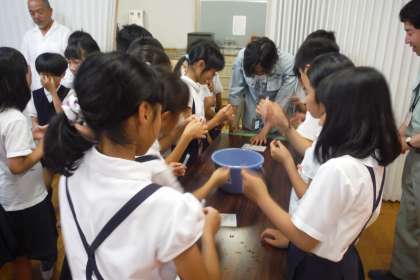 昨日、大阪府西大阪治水事務所神崎川出張所職員の方による出前講座が行われました。第1回目の昨日は、パワーポイントにより防潮堤の役割の説明や水質実験等を行ってもらいました。現在、校区にある防潮堤も「洪水」「高潮」「津波」等から中島町を守るべく補強工事を行っていること、また、神崎川の水質と水道水を比較して、魚が住める川にしていくことを目指して日々取り組んでおられることを学習しました。