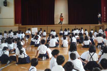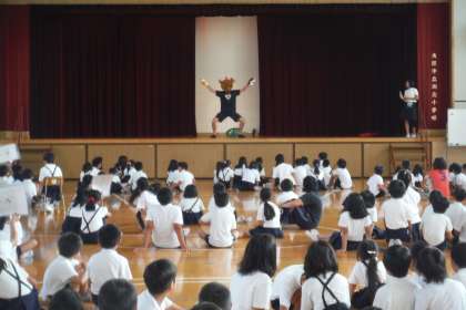 本日の児童集会は、「舞台を通る先生は誰でしょ?」というクイズに各班が答える活動でした。先生方は、子どもたちに分からないようにそれぞれで変装等をして登場してくださいました。
